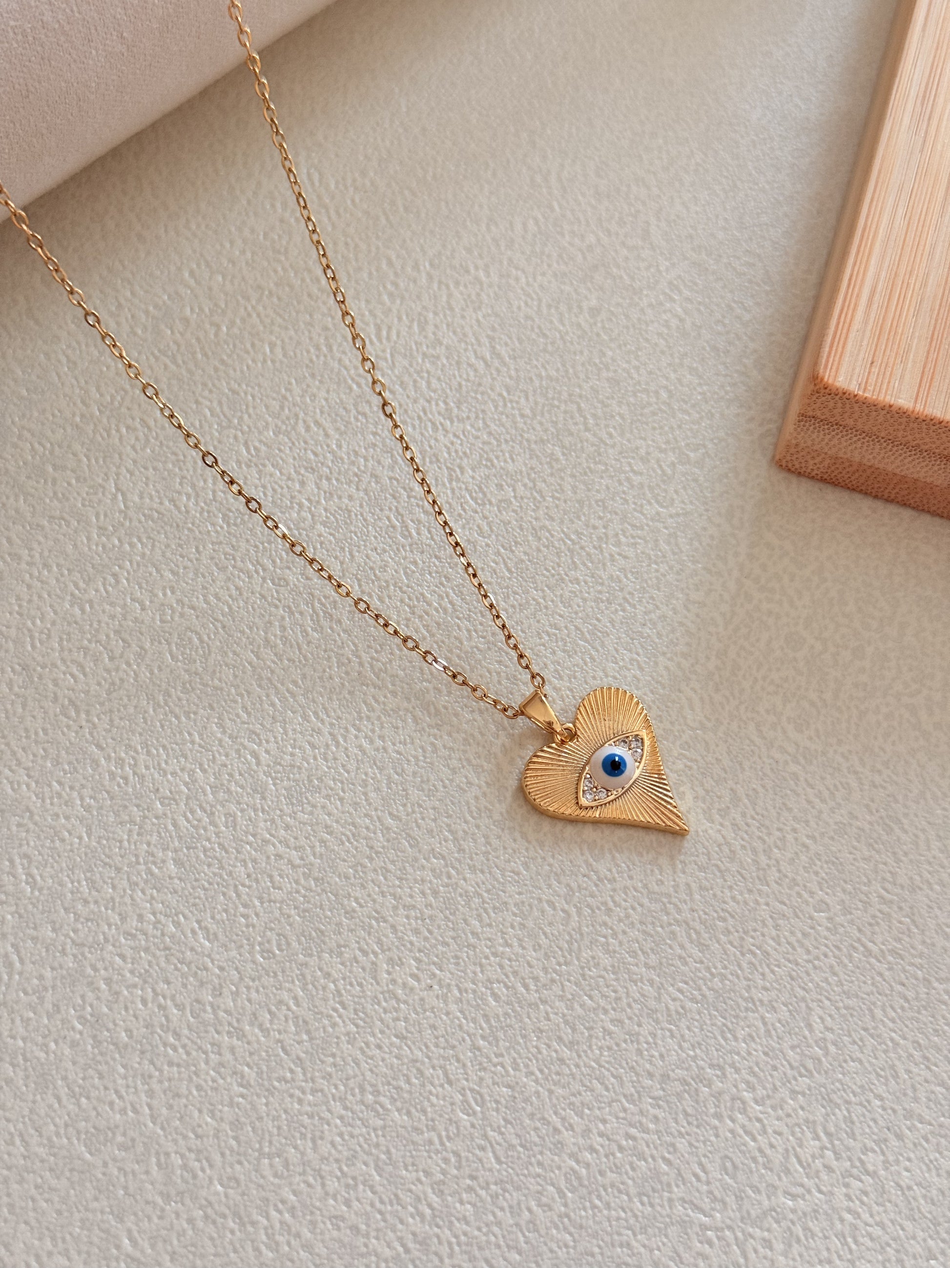 Introducing the Evil Eye in Heart Necklace. Crafted with 18k gold plating, this necklace is not only stunning, but also anti-tarnish and waterproof. Its hypoallergenic design makes it perfect for daily wear. For best care, avoid chemicals such as perfume. Protect yourself and add a touch of elegance with this necklace.